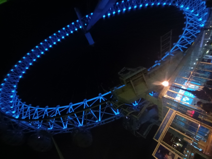 - "This night-time image captures a significant portion of the London Eye, a large cantilevered observation wheel, illuminated prominently with bright blue lights against a dark sky" by FM-MiSLx2, licensed under CC BY 4.0