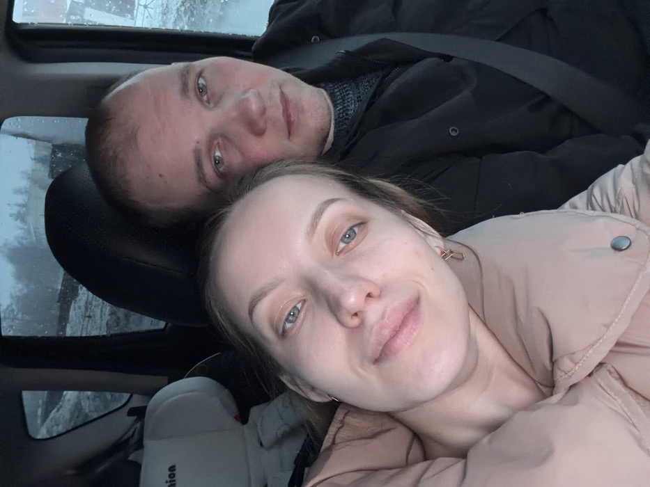 The image depicts two individuals, a female and a male, inside a vehicle in the city of Спас-Заулок, Russia, under overcast or rainy conditions. The female, positioned in the left foreground, has fair skin, light-colored eyes, and light hair; she wears a light pink or beige puffer jacket and small gold-colored chain-link earrings. Her head is slightly tilted, and she exhibits a subtle smile while looking towards the camera. The male, positioned behind and to the right of the female, has fair skin, light eyes, and short light hair; he wears a dark jacket over a dark, textured sweater, and a dark seatbelt is visible across his chest. He looks directly at the camera with a neutral expression. In the left background, a white child car seat with partially visible text is present in the rear passenger area. Through the vehicle windows, an exterior scene is visible with moisture on the glass, muted lighting, and indistinct vegetation or structures under an overcast sky.