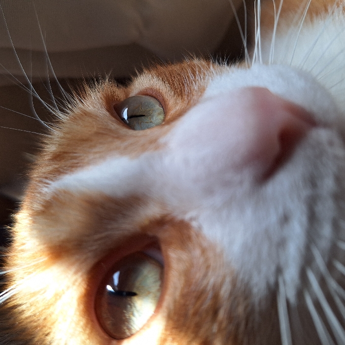 A close-up shot from a low angle features an orange and white cat. The cat's pink nose is prominent and slightly out of focus. Sharp details highlight the eyes, one catching sunlight creating a bright gleam, and its whiskers. The fur texture is visible, contributing to the overall soft and warm aesthetic of the image.