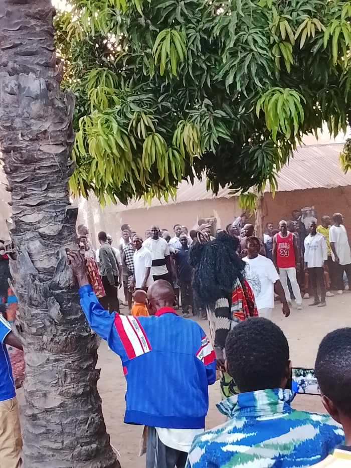 An outdoor gathering of approximately 25-30 individuals is depicted in Tabu, Nigeria. In the central midground, a masked figure (masquerade) stands, adorned with a dark, shaggy head covering and a colorful, striped fabric draped over a white garment. This figure is observed by a surrounding crowd, primarily composed of adult males in casual clothing, including one individual wearing a red 'BULLS 23' jersey. In the left foreground, an adult male, viewed from the rear, wears a blue jacket with red and white stripes and a 'PUMA' logo, extending his left hand towards the rough trunk of a large palm tree. To the right foreground, another individual, seen from behind, wears a blue and white patterned shirt and records the scene horizontally with a smartphone. The ground consists of unpaved earth. A large green-leafed tree dominates the upper portion of the frame, and a simple building with a corrugated metal roof is visible in the background.