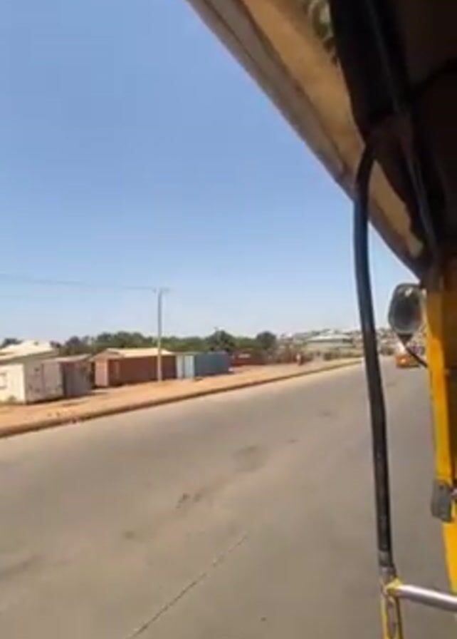 The video, taken from inside a yellow three-wheeled vehicle, shows a paved road under a clear blue sky. The road has lines indicating lanes. Several motorcycles and a minivan pass by on the road. In the background, there are storage containers, buildings, power lines, and some sparse vegetation. The recording is slightly shaky, and the view is partially obstructed by the vehicle's roof and frame.