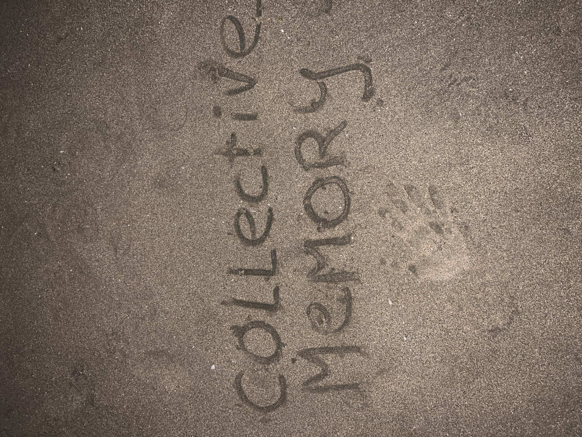 This image presents a top-down, close-up view of a light brown, granular sandy surface in Kerobokan Kelod, Indonesia. The words "COLLECTIVE MEMORY" are inscribed into the sand across two lines, with "COLLECTIVE" centered above "MEMORY." The letters are capitalized and formed by depressions in the sand. Below and to the left of the word "MEMORY," a distinct impression of a human left hand is visible in the sand, showing outlines of the palm and fingers. No individuals or external objects are present in the frame. The sand appears uniformly illuminated, highlighting its texture and the carved inscriptions and print.