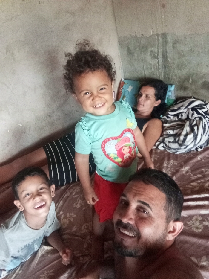 A selfie captures a family scene. A man with a beard smiles into the camera, while a toddler with curly hair, wearing a Strawberry Shortcake shirt, stands next to him, also smiling. A young boy is lying down on the left also smiling. A woman reclines on a pillow in the background. They appear to be on a bed with a patterned sheet, in a room with textured, unfinished walls.