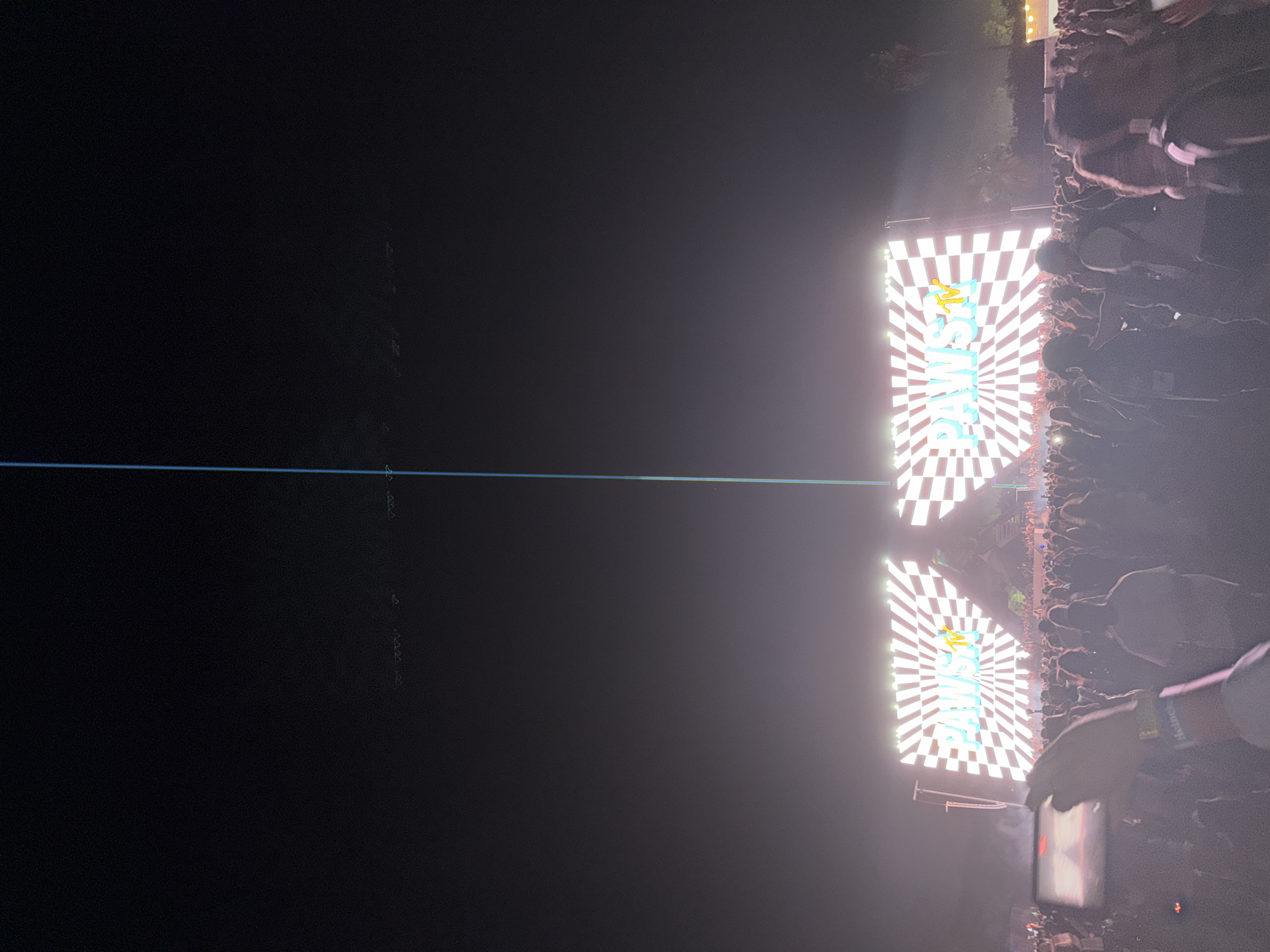 night scene in Indio, United States of America. A crowd is gathered in front of a stage with two large screens. The screens display a checkered pattern radiating from the center, with the word "DAWNSIDE" in bright colors in the middle. Some people in the crowd are holding up phones or cameras. The environment is dark.