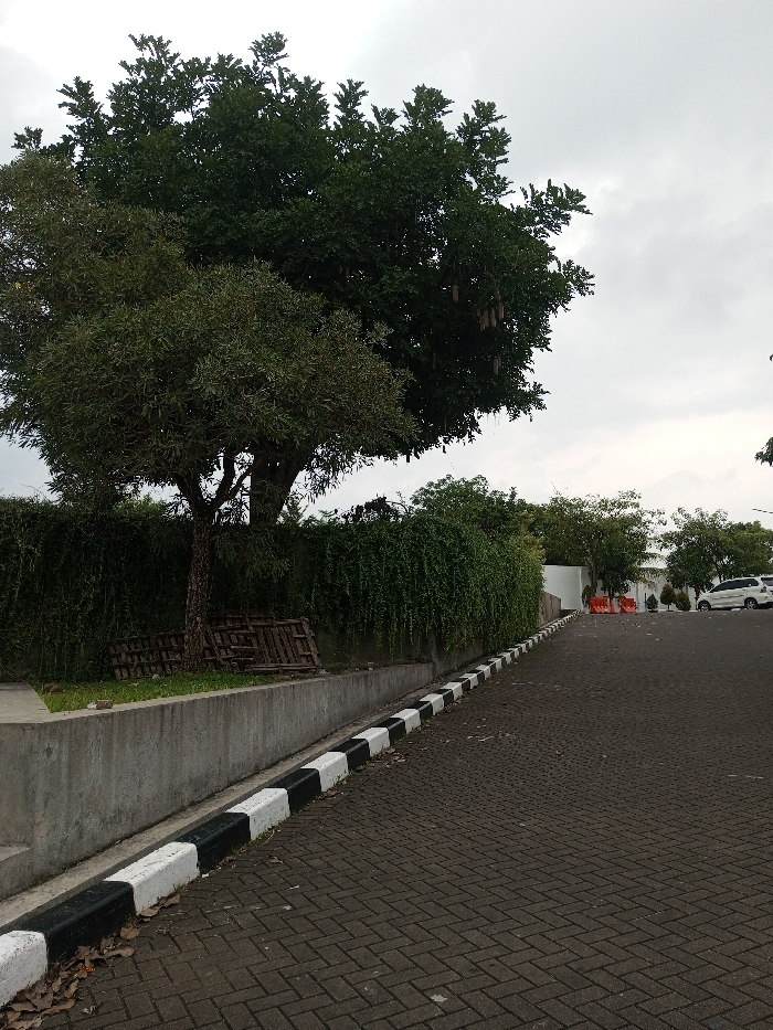 The image depicts an outdoor, landscaped environment in Cianjur, Indonesia, under an overcast sky. A dark grey paver pathway, laid in a herringbone pattern, occupies the right and central portions of the frame, sloping gently upwards towards the background. Along the left side of the pathway, a concrete curb is painted with alternating black and white stripes. Behind this curb, a concrete retaining wall supports a grassy strip where a small tree with light green foliage stands. Immediately behind this tree, a stack of wooden pallets is visible on the ground. Further left and above, a large tree with dense, dark green foliage, from which several elongated, brown, pendulous fruits hang, dominates the upper left quadrant. A dense hedge of dark green, cascading vines forms a continuous boundary behind the concrete wall, extending from the left to the mid-right background. In the background on the right, sections of white buildings or structures are visible, and several vehicles, including a white minivan, are parked. Two orange traffic cones are positioned near the entrance of one of the buildings. No individuals are present in the scene.
