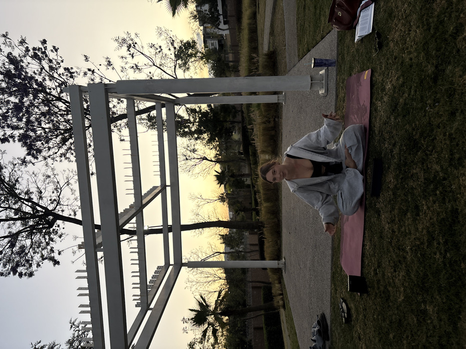 The image depicts an outdoor scene in Tlaxcalancingo, Mexico, at twilight, characterized by a soft gradient of light from a pale sky to a yellow-orange horizon. A single female individual is centrally positioned, seated cross-legged on a maroon yoga mat placed on green grass. She wears a black top, a light gray unzipped hooded jacket, and matching gray sweatpants. Her hands are open with palms facing upwards, and she looks directly at the camera with a slight smile. Behind the individual, a light-colored concrete slab extends, leading to a prominent white metal pergola structure overhead. Various trees, including palm trees and deciduous trees, frame the background, with distant buildings visible through the foliage. To the immediate left of the yoga mat, a pair of gray athletic shoes and dark sandals rest on the grass, alongside a small black electronic device on the mat. To the right of the mat, a blue and white disposable cup with a red straw stands on the concrete. Further to the right, on the grass, are a reddish-brown shoulder bag, a stack of papers or a book, and a pair of dark sunglasses. The ground consists of manicured grass and paved sections.