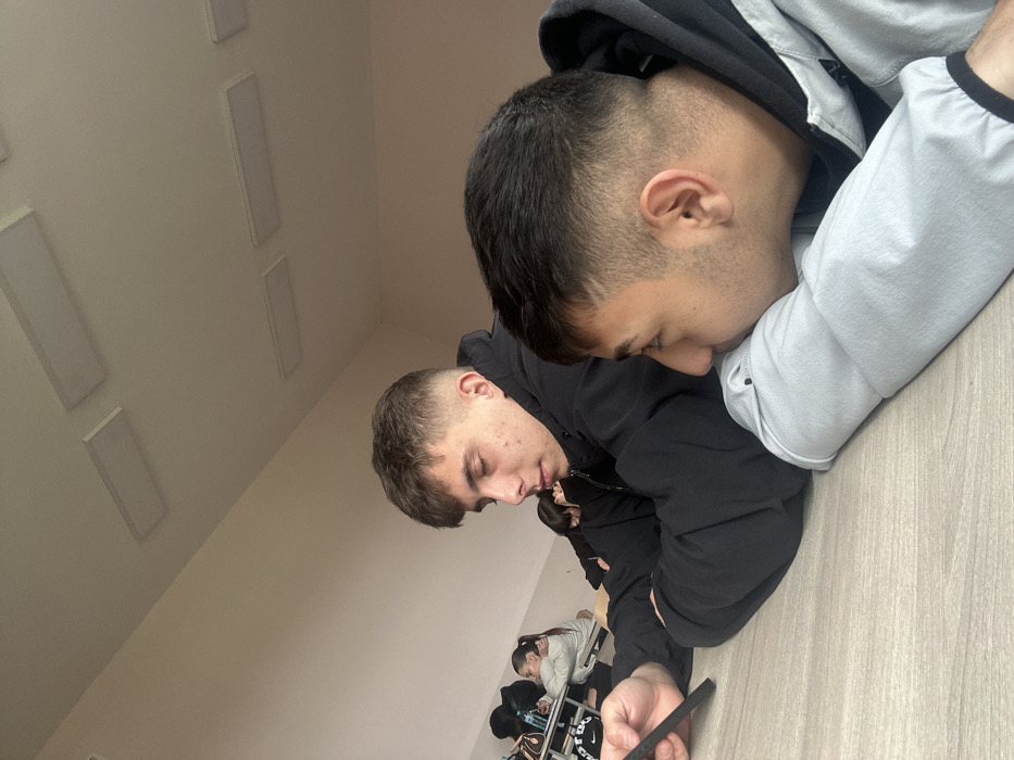 The image depicts an indoor scene, likely a classroom or lecture hall, potentially in Dolni Dabnik, Bulgaria, though the specific city location is not discernable from the visual content. In the foreground, two young men are seated at a light-colored wooden desk. The man on the left, with short brown hair cut in a fade, wears a black hooded jacket. He holds a dark-colored smartphone in his left hand, looking down at the screen. His right arm rests on the desk. The man on the right, partially visible from the side, also has short dark hair cut in a fade. He wears a light gray hooded jacket with black cuffs. His head is turned slightly to the left, towards the other man, and his left arm is bent, resting on the desk. In the blurred background on the left, several other individuals, likely students, are visible seated at similar desks. One female student with dark hair tied back is discernible, wearing a light-colored top and appearing to be looking at a phone or object on her desk. A black bag is visible on an adjacent desk. The room features light-colored, possibly beige or off-white, walls and a matching ceiling. Several rectangular, recessed LED light fixtures are installed in the ceiling. The overall lighting is bright and even.