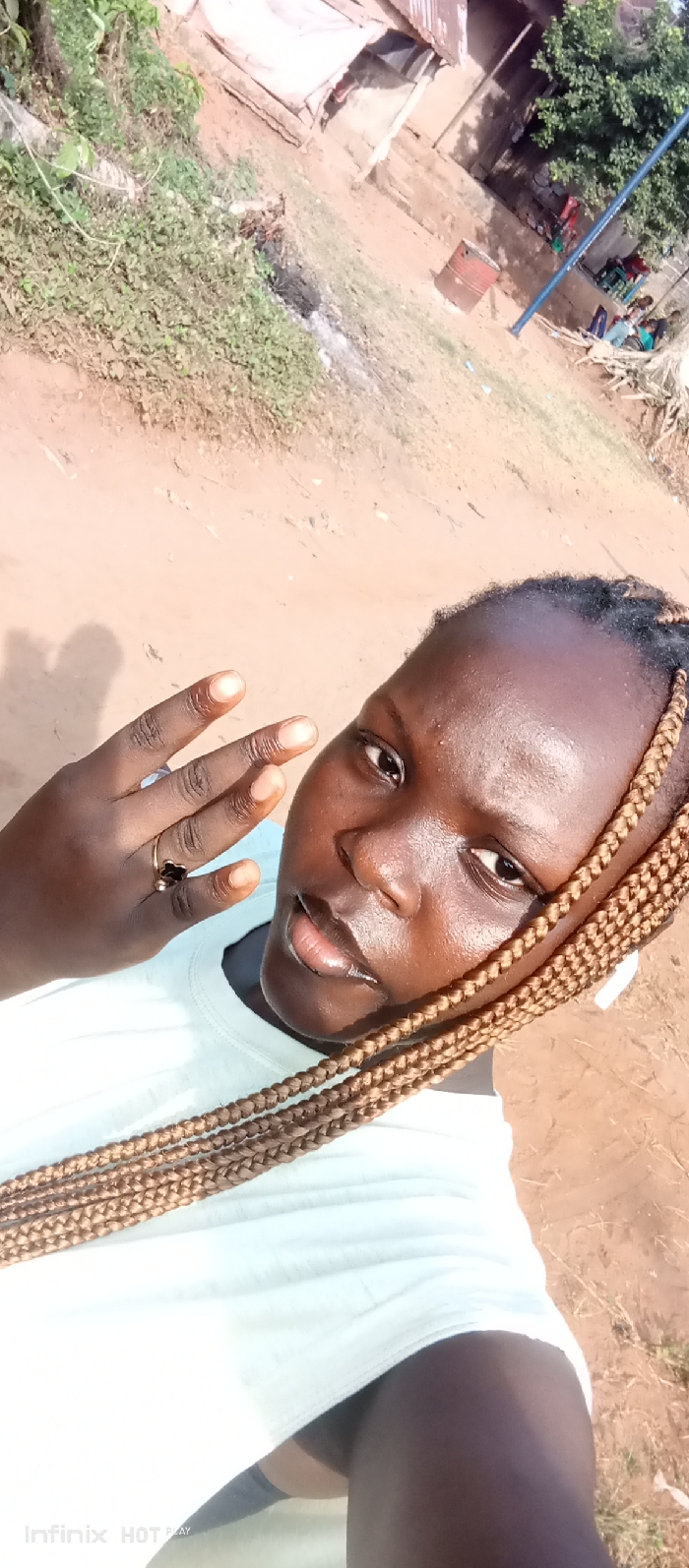 A selfie of a young woman with braided hair. She's wearing a white t-shirt and has a flower ring on her finger. The background shows a dirt road and some buildings, suggesting a rural or less developed area. People are gathered near a structure in the distance. The overall impression is a casual snapshot taken outdoors.