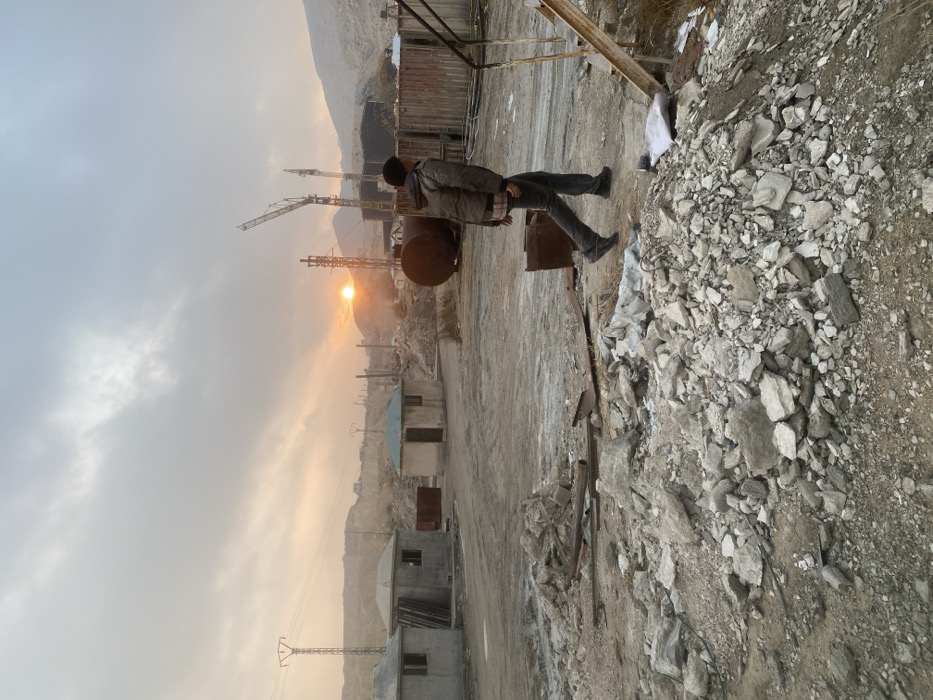 A man in a jacket and dark pants stands amidst a construction site or quarry. Overhead cranes are visible in the distance against a hazy sky with the sun peeking through. The ground is rocky and dusty with piles of debris. Simple concrete buildings are dotted along the landscape. The setting sun casts a warm glow over the scene.
