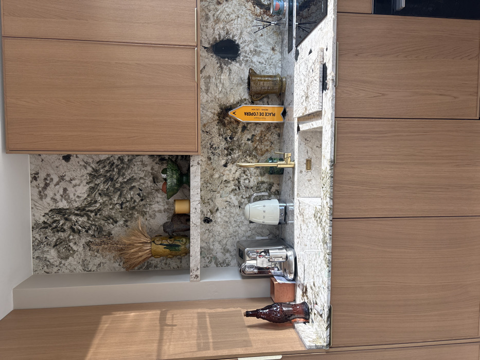 This is an indoor forensic image of a modern kitchen located within an apartment in Courbevoie, France. The scene is dominated by light-toned natural materials, specifically light wood cabinetry and granite countertops and backsplash. The upper section of the image features a light-colored granite backsplash with prominent dark grey and black veining, extending up the wall. Above a narrow, light-colored shelf positioned mid-wall, a second panel of similarly patterned granite serves as an accent. On this shelf, from left to right, are a yellow-ochre textured vase containing dried wheat stalks, a dark, textured elephant figurine, a small yellow cylindrical object (possibly a candle or holder), and a green, textured bowl holding several reddish fruits. To the right of the accent panel are two light wooden upper cabinet doors with minimalist integrated handles. The main countertop is constructed from a matching light granite, speckled with darker inclusions. From left to right on the countertop: a dark brown, ornate glass bottle with a cork stopper stands next to a small, light orange box. Adjacent to these are a silver, stainless steel espresso machine and a white Smeg brand electric kettle. A single integrated granite sink is centrally positioned, equipped with a gold-colored faucet. To the right of the sink, a yellow, upward-pointing sign with black text reads "PLACE DE L'OPERA PARIS 8,0 Km". Further right, a dark brown ceramic pitcher rests next to an aroma diffuser with reeds. A small, patterned bowl sits on the far right edge of the counter. A black induction cooktop is visible on the far right, partially covered by a matching granite slab or cutting board. A black kitchen utensil hangs against the backsplash above the counter's right side. The lower section displays light wooden cabinetry, mirroring the upper cabinets, with integrated horizontal handles. Four cabinet doors or panels are visible. A dark appliance, likely an oven or dishwasher, is partially visible below the induction cooktop on the far right. Natural light enters from the left, casting a distinct shadow on the leftmost wooden cabinet panel. No individuals are present in the scene.