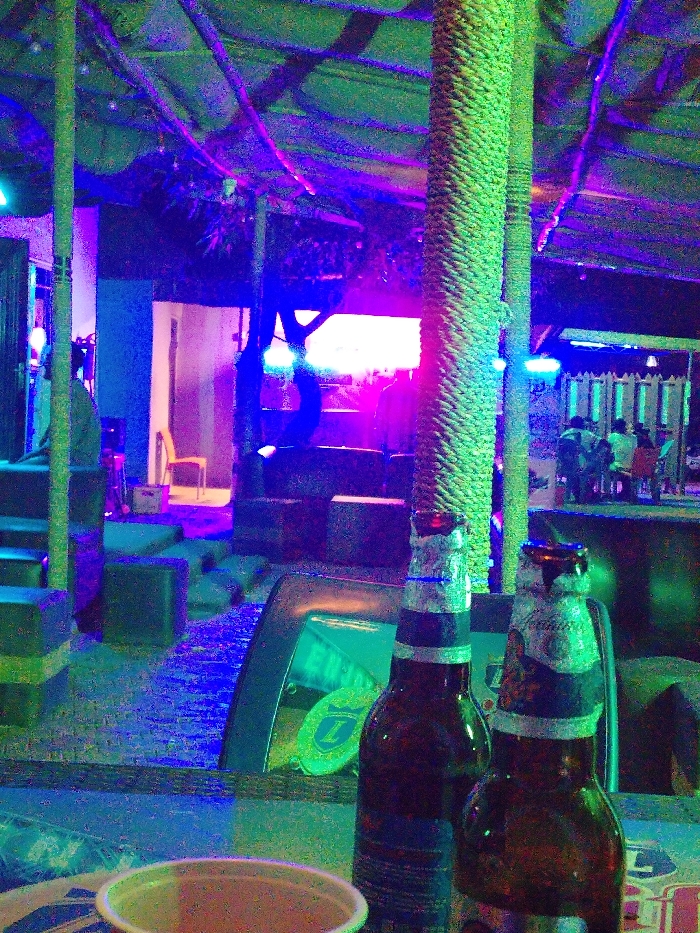 Two beer bottles stand on a table with a partially filled plastic cup. Behind them, rope-covered pillars extend to a ceiling lit with vibrant blue and green hues. In the background, open doorways lead to outdoor seating areas. People are visible in the distance, and the scene has a relaxed, nightlife atmosphere. The lighting enhances the colors, creating a dynamic and inviting ambiance.