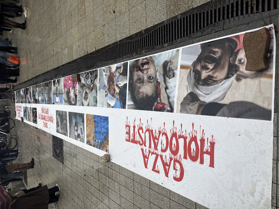 The image displays a long, white banner laid flat on a wet, grey paved surface in an urban public space in Lyon, France. The banner is secured by several small, reddish-brown bricks or stones. Prominent red text, styled with a dripping blood effect, is visible on the left side of the banner, spelling "GAZA HOLOCAUSTE." Adjacent to this text and extending along the banner are multiple photographic images, arranged in columns. These images depict graphic scenes, including a close-up of a child with severe facial injuries and blood, an adult with a bloodied head wrapped in white cloth, and other images showing bodies, debris, and blue tarpaulins or body bags. The paved ground is visibly wet, with water droplets on the banner. A long, black metal drainage grate runs parallel to the banner on its right side. In the background, several individuals are partially visible standing on the wet pavement, some holding umbrellas, indicating recent or ongoing rain. A bicycle wheel is also partially visible in the mid-ground, left of the banner.