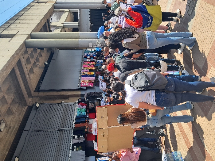 - "A daytime scene depicts a dense gathering of approximately 30-50 individuals on a paved pedestrian area in an urban setting of Caracas, Venezuela, specifically under a large, multi-level concrete brutalist-style structure" by FM-kmeYo1, licensed under CC BY 4.0