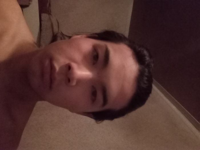 A close-up, angled shot features a shirtless man with short, dark hair. His face is the focal point, displaying a neutral expression. The background is dimly lit, with a wall partially visible. The overall tone is intimate and casual.