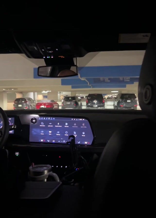 interior of a car in a parking garage. It is dark inside the car, but the dashboard and infotainment screen are illuminated. The screen shows various icons for car functions. Outside the car, several vehicles are parked, including a red sports car and multiple black SUVs. Signs are visible in the background, including one that says "Up Arriba Exit". A person is briefly seen in the rearview mirror. Someone can be heard speaking in Spanish.