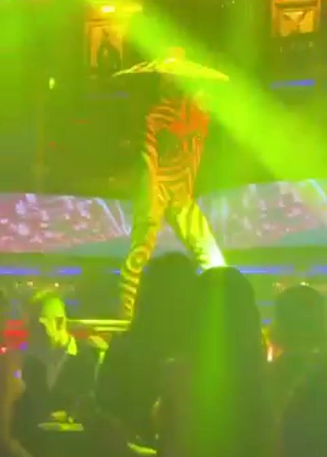 person on a stage in a club or bar. The person is wearing a full-body suit with a zebra stripe pattern and a large hat. They are moving and appear to be performing. The lighting in the room is dark, with green and red stage lights illuminating the performer. In front of the stage, the backs of heads of people in the audience are visible. There is a large screen behind the performer showing a digital pattern of white dots on a blue and purple background. Architectural details like framed pictures and a chandelier can be seen. A sign with an arrow is also visible in the background.