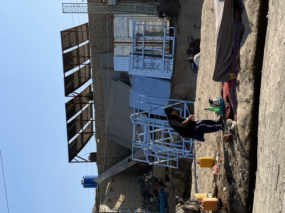 The image portrays an outdoor commercial or workshop area in Kōkrān, Afghanistan, under a clear blue sky