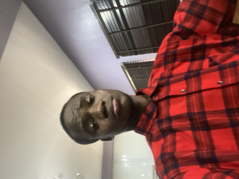 A dark-complexioned male individual is depicted indoors, framed from the chest up, looking directly at the camera. He wears a red and black plaid collared shirt with metallic buttons. His hair is dark and short. The background features a white ceiling, partially revealing a ceiling fan on the left. The left wall is white, and the right wall is a muted purple. Two window units, covered with closed, dark-colored horizontal blinds, are visible on the right side. The exact location within Egan, Nigeria is not discernible from the image.