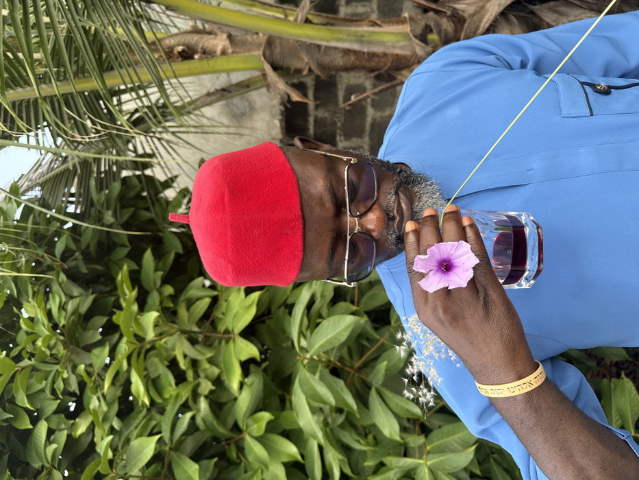 An adult male with dark skin and a graying beard is depicted outdoors in Ado, Nigeria. He wears a blue long-sleeved tunic, a red conical hat, and gold-framed aviator-style sunglasses. A gold-colored cuff bracelet with Hebrew script is on his left wrist. The man holds a clear, faceted glass containing dark red liquid in his right hand. His left hand gently holds a single purple morning glory-type flower with a green stem, positioned above the glass. A thin, light-colored strand extends downward from his left hand. Small white plant fragments or seeds are visible near his left forearm. The background consists of dense green foliage on the left, and a grey brick wall partially obscured by a palm tree trunk and fronds on the right. The man is looking downwards, focusing on the objects he holds.