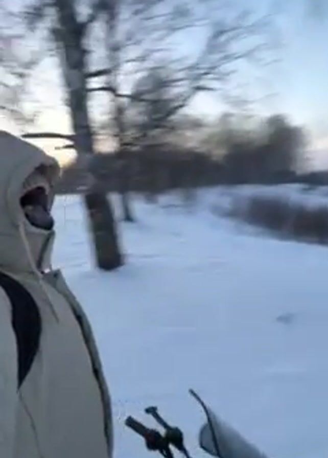 person riding a snowmobile through a snowy landscape. The person is wearing a light-colored hooded jacket and a backpack. The snowmobile is white with red accents. The landscape is flat and covered in snow, with sparse trees. The sky is a clear blue with a pink and orange glow on the horizon. A crescent moon is visible in the sky. The camera is mounted on the snowmobile and is moving forward. The video is slightly blurry and shaky.