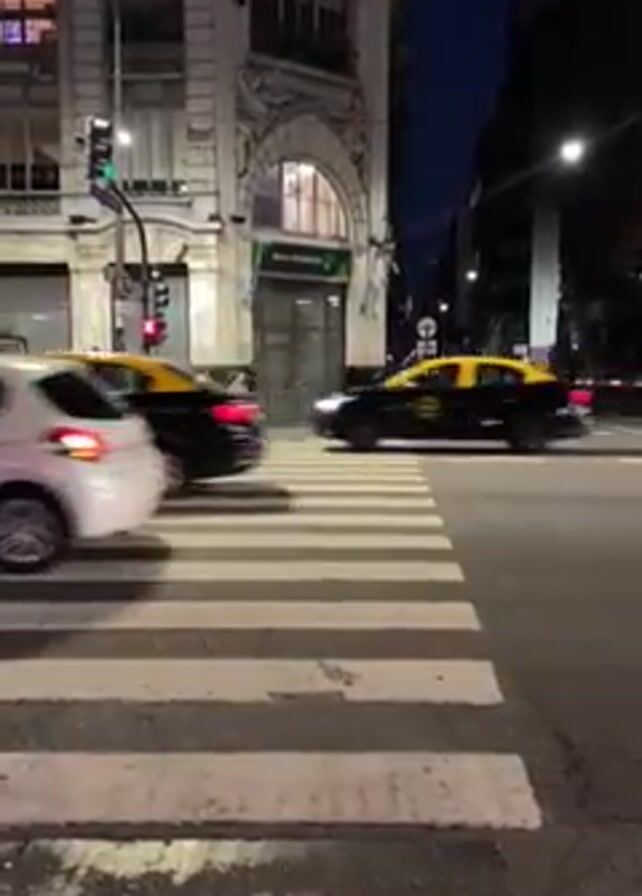 street scene at night in a city with tall buildings and streetlights. Multiple vehicles including a white car, a yellow and black taxi, a black car, and a red car cross a crosswalk. People are walking on the sidewalks. The video is shot from a stationary position near the crosswalk.