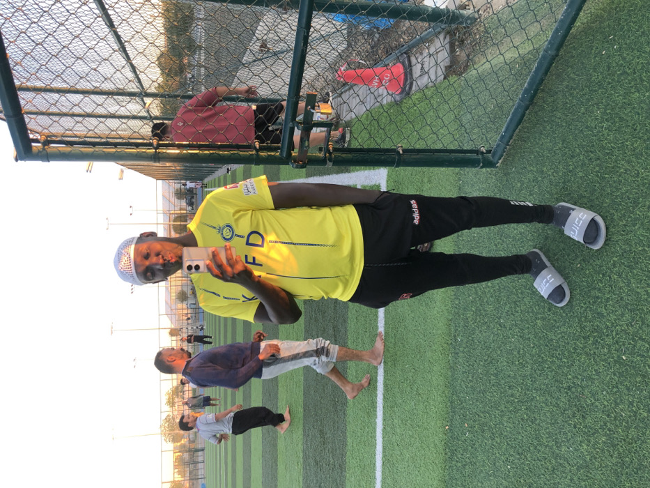 This image depicts an outdoor artificial turf sports field in Hanak, Saudi Arabia, under late afternoon or early evening light. A male subject, appearing to be of African descent, stands prominently in the foreground, facing the camera. He wears a white kufi, a yellow short-sleeved football jersey with "KFD" and a club crest, black Adidas sweatpants, and grey slide sandals over grey socks. He holds a silver-colored smartphone in his right hand, reflecting light, with his left hand in his pocket, and his lips are slightly puckered. In the mid-ground, to the left of the primary subject, several men are present on the artificial turf. One man in a dark blue long-sleeved shirt and grey sweatpants is walking barefoot. Another man in a light grey t-shirt is partially visible further back. White lines mark the boundaries of the playing field. To the right of the foreground subject, a green chain-link fence runs parallel to the field. Beyond this fence, a red and white traffic cone is visible on the ground, and another male figure, seen from behind in a reddish-pink shirt and dark shorts, is walking away from the camera. The background reveals additional light poles, buildings, and an undeveloped area under a clear, bright sky. The warm, golden light indicates a low sun angle, casting moderate shadows.