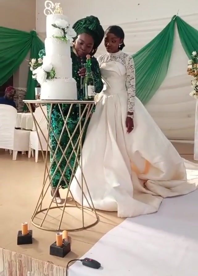On a stage draped in white fabric, a wedding scene unfolds. A bride in a long-sleeved white gown stands next to a woman in a green dress and headwrap. They are positioned near a tall, thin gold stand that supports a four-tiered white wedding cake, adorned with white flowers and a "Mr & Mrs" topper. The woman in green holds a microphone and a green bottle, seemingly giving a speech or toasting. Three candles in black holders are placed at the base of the stand. The backdrop features green and white draping, and tables with white tablecloths and chairs are visible in the background.