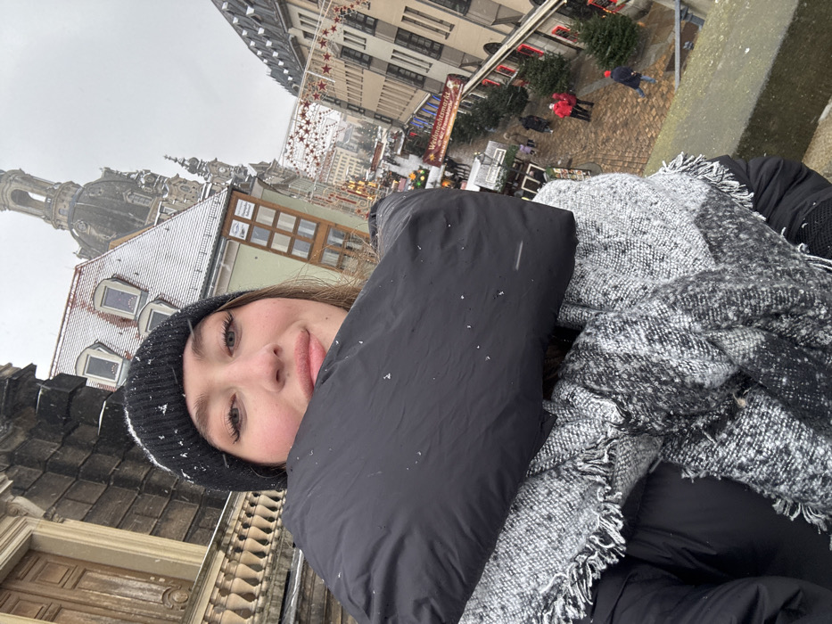 A female subject is depicted in a close-up, chest-up selfie, looking directly at the camera with a subtle smile. She has fair skin with rosy cheeks, dark hair, and wears a black knit beanie, a black puffer jacket, and a thick grey and black patterned scarf with fringed edges. Small snowflakes are visible on her beanie, jacket, and scarf. The scene is outdoors during light snowfall under an overcast sky. The subject is positioned on an elevated stone structure, evidenced by an ornate balustrade and classical building facade to her left. Below and behind the subject, a street-level Christmas market (Weihnachtsmarkt) is active in Dresden, Germany, specifically in the Neumarkt area facing the Frauenkirche. The market street is adorned with festive string lights featuring star motifs and lined with multiple market stalls and small evergreen trees. A partial sign indicating "Weihnachtsmarkt" and "Frauenkirche" is visible above one stall. Several pedestrians are present on the market street, some wearing red outerwear. In the mid-ground, traditional European buildings with snow-dusted roofs and dormer windows line the street. The prominent dome and spire of the Frauenkirche are clearly visible in the far background, confirming the location.