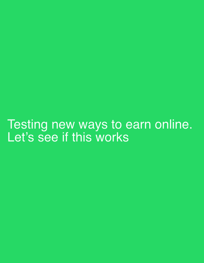 A digital image displays a solid, uniform green background. Centered towards the lower portion of the frame, white sans-serif text is present. The first line of text reads, "Testing new ways to earn online." The second line below it states, "Let's see if this works". No people, subjects, objects, actions, interactions, or environmental details are depicted within the image itself. The specified location is Gauting, Germany.