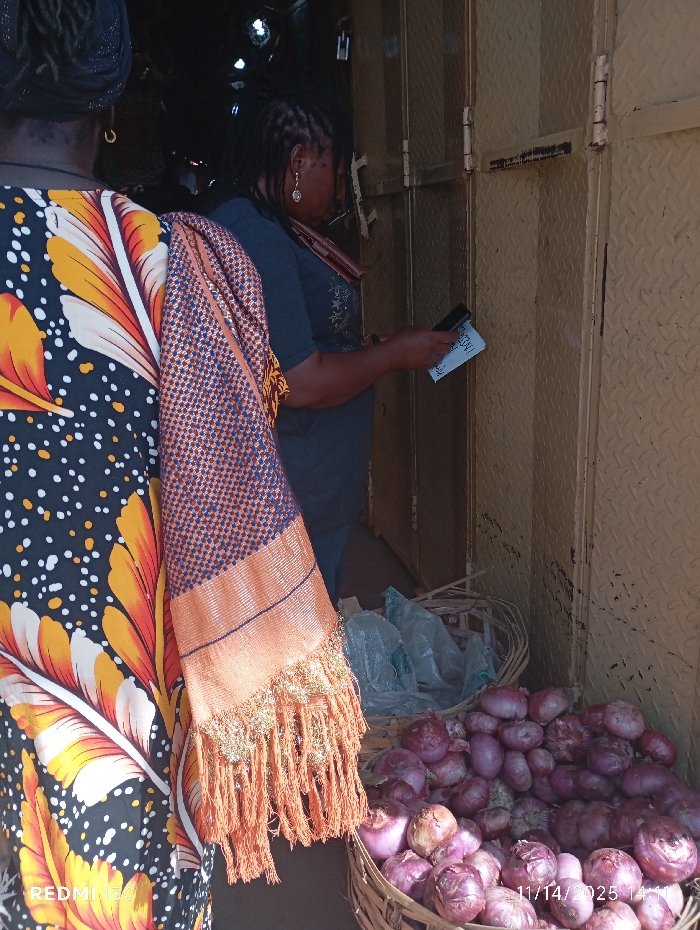 Two women stand near a vendor selling onions. One woman, closer to the camera, wears a colorful dress with a scarf draped over her shoulder. The second woman, facing away, holds a small paper, perhaps a shopping list or receipt. Baskets overflow with purple onions on the ground, next to plastic bags inside a basket. The setting appears to be an outdoor market. A patterned metal structure forms the background, suggesting a stall.