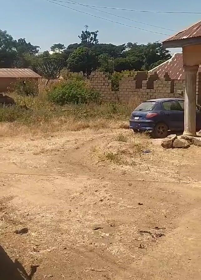 stationary outdoor scene under a clear blue sky. The ground is predominantly dry, reddish-brown soil with scattered patches of dry grass and sparse vegetation. A dark blue hatchback car is parked near a partially constructed brick wall to the right of the frame. In the background, there's a simple, one-story building with a rust-colored roof, surrounded by greenery. Power lines stretch across the top of the frame. In the foreground, there is a rough, gray rock with a short, rusty metal pole attached, suggesting a possible makeshift structure.