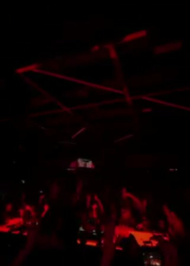 dimly lit nightclub with red lighting. The audience is visible, facing the stage and waving their hands in the air. The stage has a raised platform where the DJ is likely positioned. The ceiling is partially visible and features a geometric arrangement of lighting fixtures. The atmosphere suggests a lively and high-energy event.