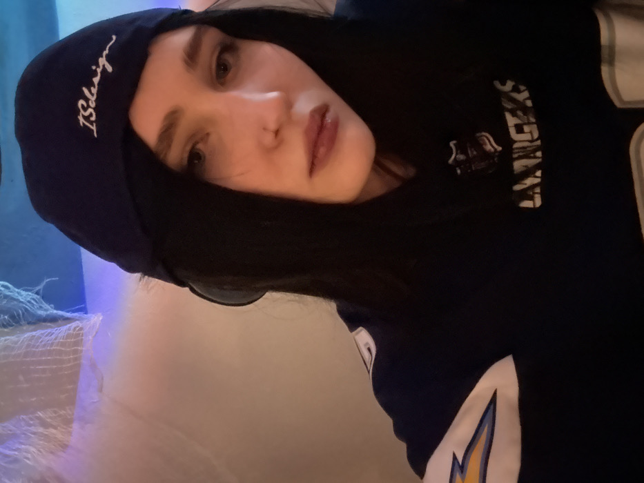 The image presents a close-up, chest-up view of an individual positioned indoors. The specific location in the city of Warsaw, Poland, or any other geographic detail, is not discernible from the visual evidence. The subject is a person with long, dark, straight hair, a light complexion, and a small stud piercing on the right nostril. They are looking directly at the camera with a neutral expression. The individual is wearing a dark blue cap or beanie featuring white embroidered text, "ISdesign," on the front right side. Below the cap, they are wearing a dark blue long-sleeved garment, likely a hoodie or jersey, which prominently displays the white distressed text "Chargers" on the chest. An NFL shield logo is visible above the "Chargers" text. Part of a white and yellow lightning bolt design, characteristic of the Chargers team, is visible on the left shoulder/sleeve. The background is out of focus and indistinct, showing muted colors, including soft pink/purple tones on the left and a blue light source on the upper right. A textured, possibly draped, white material is visible in the upper left background. Lighting appears dim and artificial.