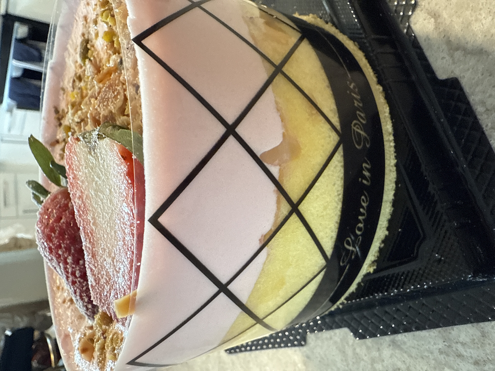 A slice of cake in a transparent plastic container with a black rim sits on a neutral surface. The cake has a pink layer and a yellow layer, visible through the container's graphic design of intersecting black lines. The label on the container reads "Love in Paris". The cake is topped with a sliced strawberry and a crumbly topping. A black plastic tray with textured edges is partially visible beneath the container. The location of the image is the city of Orlando, United States.