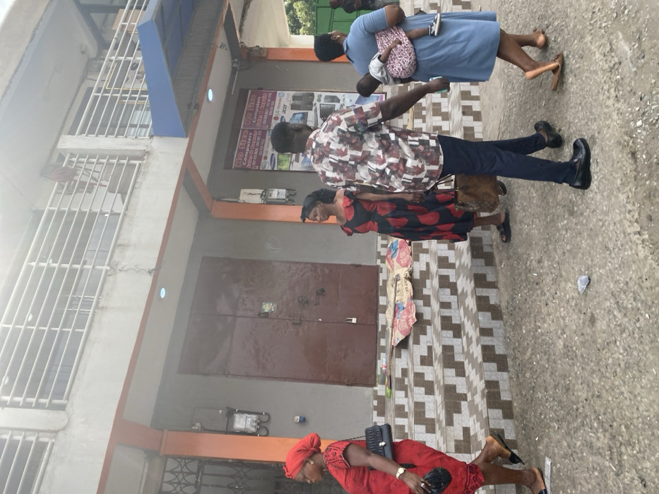 The image displays a street scene in Accra, Ghana, featuring a two-story commercial building and several pedestrians