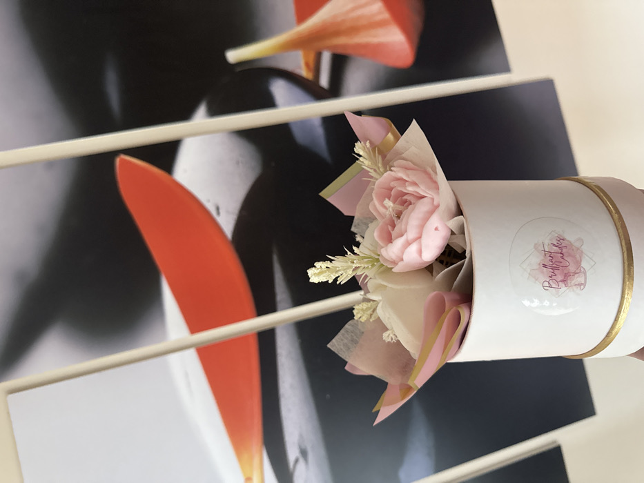 A white cylindrical container, approximately 10-15 cm in height, is held by an unseen individual, with a thumb visible on its lower right side. The container features a gold-colored rim around its base and a circular sticker on its front with "Brilliant Candles" text in a pink watercolor design, accompanied by a stylized candle icon. Inside the container is a miniature bouquet comprised of several artificial flowers, primarily light pink and white, arranged with pale green and gold tissue paper accents and dried, wispy botanical elements. The prominent light pink flower and at least one white flower exhibit visible wicks, indicating they are candles. The background is out-of-focus, consisting of a multi-panel display showcasing abstract patterns of dark grey and black contrasting with vibrant, elongated, curved orange shapes. Two slender, vertical white rods are present in the foreground, partially obscuring the background and the upper portion of the floral arrangement. The scene takes place indoors, in Cherven Bryag, Bulgaria.