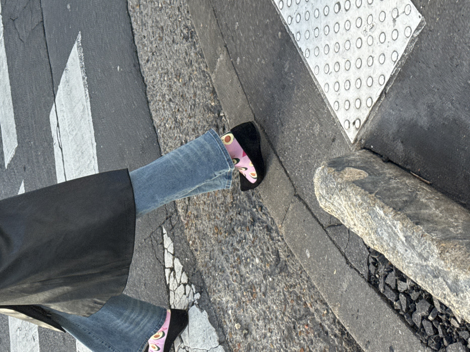 The image displays the lower portion of an individual walking on a public street, presumably in Asnières-sur-Seine, France; the specific location within the city is not visually identifiable. The person is wearing a long, dark-colored coat, light blue denim jeans, pink socks adorned with a repetitive pattern of green avocado halves, and black pointed-toe shoes with a wedge heel. The subject is captured mid-stride, with their right foot on the asphalt pavement near a concrete curb. A white-striped pedestrian crosswalk is visible on the dark grey asphalt road surface. The environment includes a rough-hewn, light grey stone block partially in the foreground on the sidewalk, adjacent to a rectangular silver metallic tactile paving plate featuring raised circular studs. Small aggregate debris is present in the gutter alongside the curb. Natural daylight illuminates the scene.