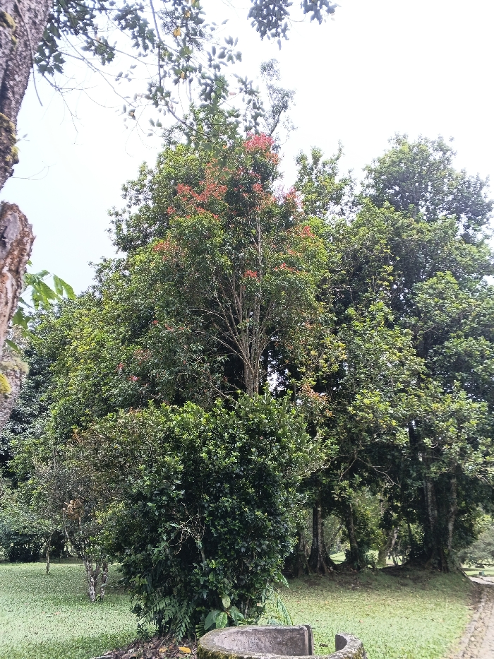 The scene, located in Kadoma, Zimbabwe, depicts an outdoor natural environment dominated by dense foliage under a bright, possibly overcast sky. In the foreground, a partial, weathered concrete ring structure with moss is situated on a manicured green lawn. To the left, a portion of a tree trunk with visible bark and moss is present. The midground features a prominent tall tree with a slender trunk and dense green leaves, interspersed with clusters of reddish-orange foliage or blossoms, particularly in its upper canopy. This central tree is flanked by numerous other trees of varying heights and densities, forming a lush green backdrop. In the far right midground, a light-colored dirt path is visible, curving out of frame. No individuals, animals, or discernible activities are present.