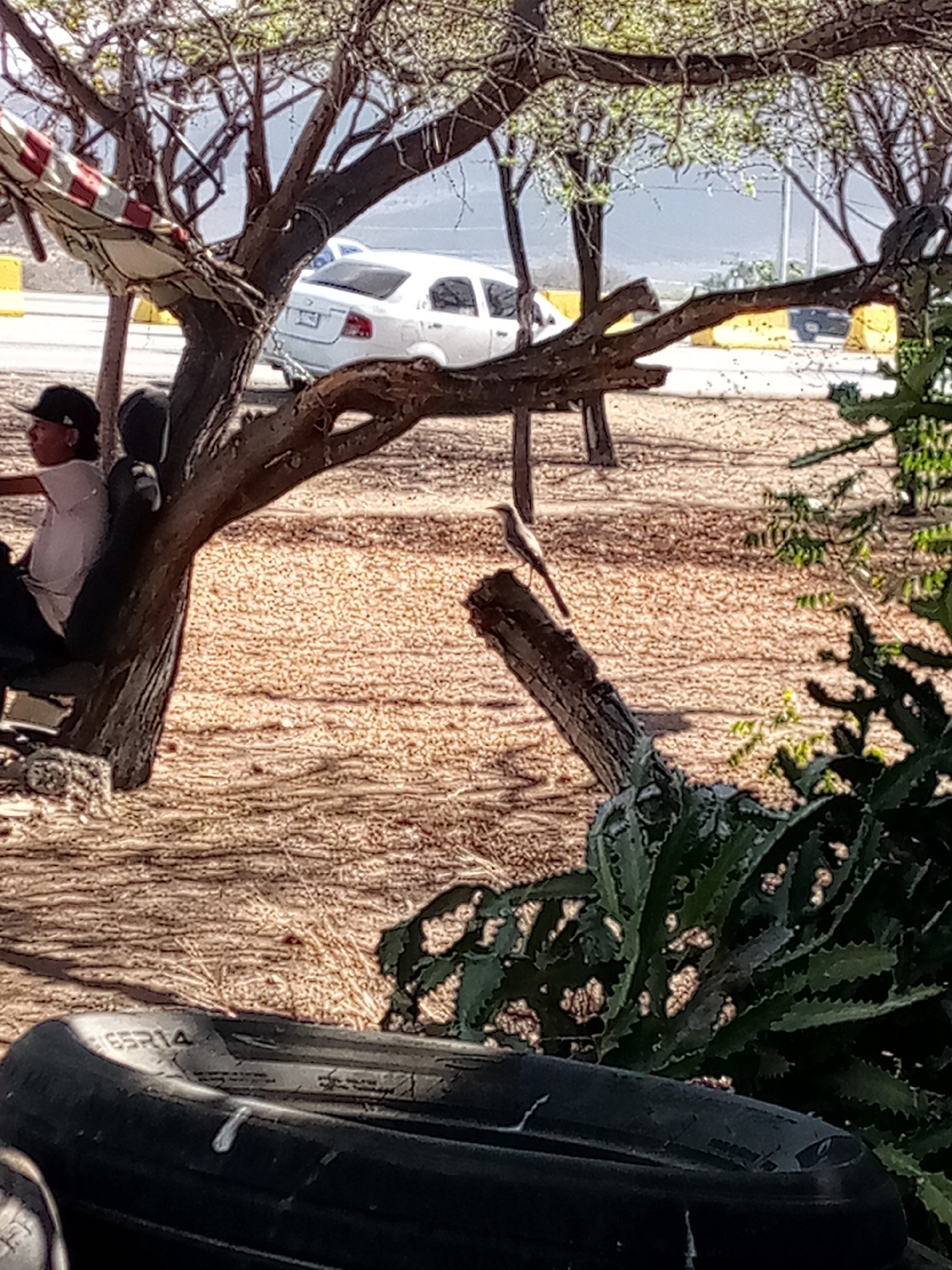 An outdoor scene in Las Guevaras, Venezuela, captured during daylight hours. The foreground features the upper portion of a black tire on the lower left, displaying "65R14" on its sidewall, and a dark green, spiky cactus-like plant on the lower right. The ground is covered with light brown, granular, dry soil or small pebbles. A person is seated on a dark object or chair, partially visible on the mid-left. This individual wears a black cap and a light-colored short-sleeved shirt, facing generally rightward. A large tree with dark, gnarled branches and sparse foliage dominates the left and central midground, obscuring portions of the background. A red and white striped fabric, consistent with an awning or tarp, is affixed to a pole or branch on the left side of the main tree. To the right of the central tree, a small, light brown bird is perched atop a dark, cut tree stump. The background reveals a paved road with yellow concrete barriers along its edge. A white four-door sedan is visible on the road, facing away and slightly to the right of the viewer. Distant, hazy landforms or mountains are discernible beneath a light blue sky.