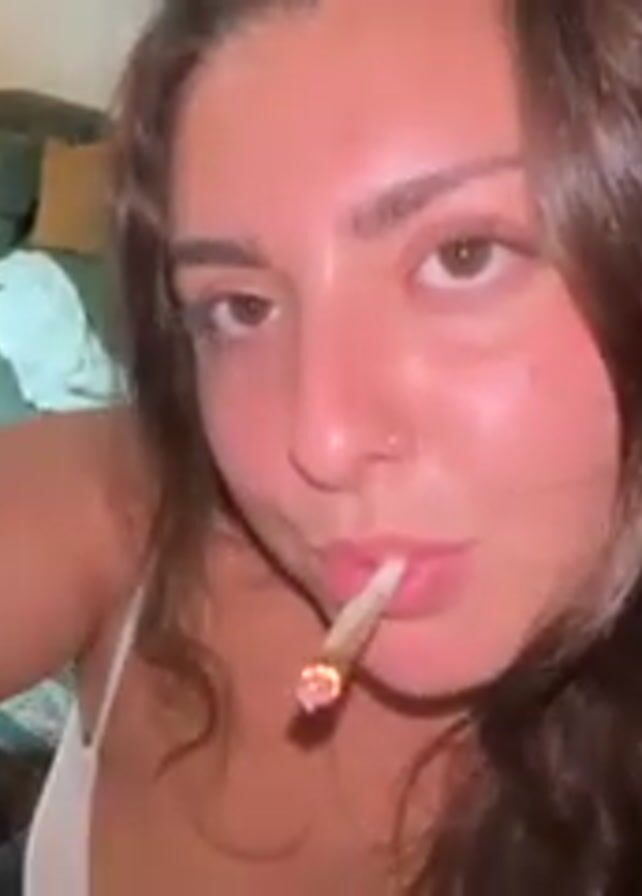 A person with long brown hair and a nose piercing is shown holding a lit cigarette in their mouth while facing the camera