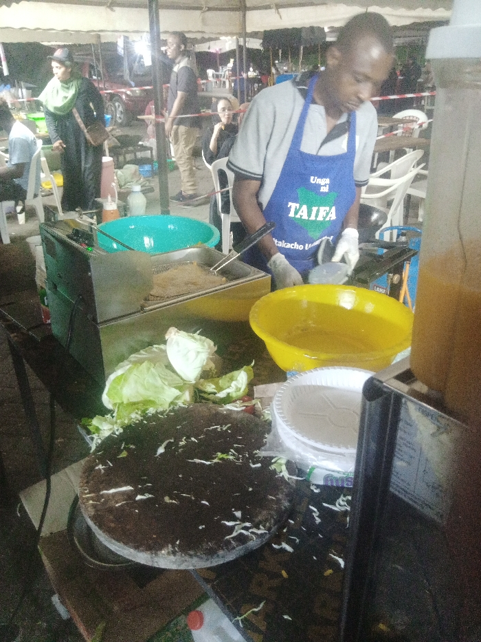 The image captures an outdoor or semi-sheltered food stall, likely operating at night or in low-light conditions, illuminated by artificial overhead lighting. The scene is consistent with an informal street food establishment in an urban area like Makadara/Mji Wa Kale ward, Kenya. In the immediate foreground, a dark, circular wooden chopping board is present, covered with white shredded cabbage and other green vegetable scraps. To its left are larger, fresh pieces of white cabbage. Adjacent to the chopping board, a stainless steel deep fryer is visible, containing a rectangular food item immersed in hot oil, with a pair of metal tongs resting on its edge. To the right of the deep fryer, a large, empty turquoise plastic basin is positioned. A dark-skinned male chef, wearing a grey short-sleeved polo shirt, a blue apron bearing the text "Unga ni TAIFA" (Flour is Nation) with a map of Kenya logo, and white disposable gloves, stands centrally, actively engaged in food preparation. His right hand holds a utensil, possibly tongs, over a cooking area. His left hand is positioned near a gas burner connected to a blue gas cylinder visible below the counter. To the chef's right, a yellow plastic bowl holds a liquid, likely oil or batter. Below this, a stack of white, disposable paper plates, encased in clear plastic, rests on the counter. A tall, clear plastic beverage dispenser, filled with an orange liquid, is partially visible on the far right. In the midground and background, under a light-colored tent canopy supported by metal poles, several other individuals are present. To the far left, a person in a light blue shirt is partially visible, seated at a white plastic chair. To the left of the deep fryer, a woman dressed in a black garment, a light green headscarf (hijab), and carrying a brown shoulder bag, stands, observing the activity. Further back, a man in a dark t-shirt and light-colored pants stands. To the right, a woman with short dark hair, wearing a dark top, is seated at a white plastic chair. Multiple white plastic tables and chairs are scattered throughout the background, indicating a dining area. A red SUV is partially visible in the distant background, suggesting proximity to a street or parking zone.