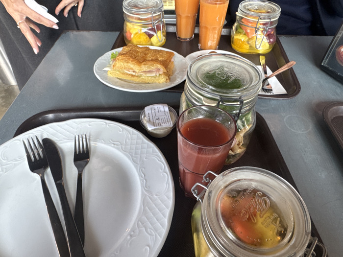 The scene displays an indoor dining setting. Two brown rectangular serving trays are positioned on a dull blue-grey tabletop. The foreground tray holds a white dinner plate with an embossed rim, upon which two dark forks and one dark knife are placed. To the right of the plate are a small clear plastic cup with a white lid containing a light-colored sauce and a paper label, a clear glass jar with a metal clasp lid holding salad, a clear glass containing a red-orange juice, and a second clear glass jar with a metal clasp lid, labeled "Fido," containing sliced fruit. The midground tray presents a white round plate with a golden-brown ham and cheese pastry, next to which rests a small paper napkin and a small spoon with a coppery handle. Further right on this tray are two tall clear glasses containing orange juice and another clear glass jar with a metal clasp lid containing various chopped fruits. In the upper left quadrant of the image, the hands of an individual are visible, featuring manicured nails and rings. The location is Unknown, Unknown.