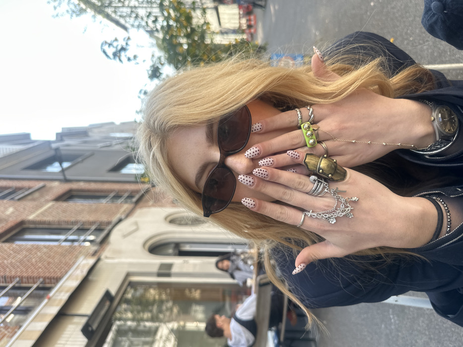 The image displays an outdoor street scene in Antwerp, Belgium. A blonde female, wearing dark oval sunglasses, occupies the foreground, facing the viewer directly. Her hands are raised, obscuring her mouth and nose. Her long, oval-shaped fingernails feature a light-colored base with black polka dots. Her left hand is adorned with multiple silver rings, including a chained ring connecting to a wider band, featuring small cross and charm embellishments, alongside various silver bands. Her right hand wears a large, ornate, antique-gold shield-like ring on the index finger, a lime-green studded ring, and other silver bands. A delicate gold-toned hand harness and a silver watch with a gold-toned face are present on her right wrist, while her left wrist displays multiple dark and silver-toned bracelets. In the mid-ground, two blurred individuals are seated at dark outdoor tables, indicative of a café or restaurant patio. The background features brick and dark-paneled buildings lining a street, consistent with European urban architecture. An awning and an outdoor heater are visible on the brick building to the left. Distant green foliage and orange traffic cones are discernible in the far background.