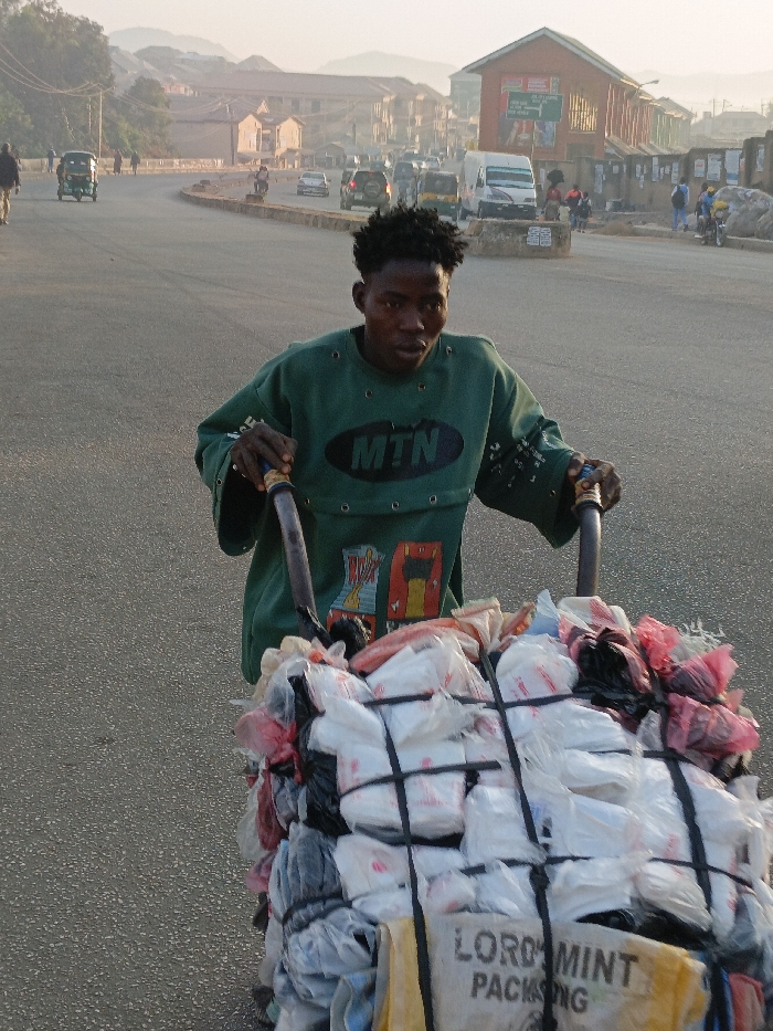 A man in a green "MTN" sweatshirt pushes a cart full of tied plastic bags down a paved street
