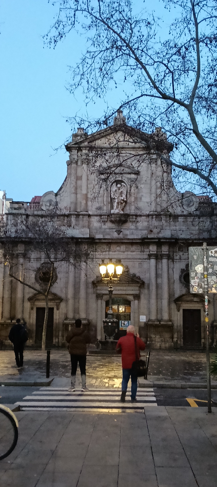 Three people cross a zebra crossing in front of a large, ornate stone building, possibly a church or public building. A streetlight illuminates the building's entrance. The architecture features classical elements, including columns and a pediment, and includes a statue. Bare tree branches frame the upper portion of the building against a cloudy sky. A street sign covered in stickers is visible on the right. The overall lighting suggests it is evening or dusk.