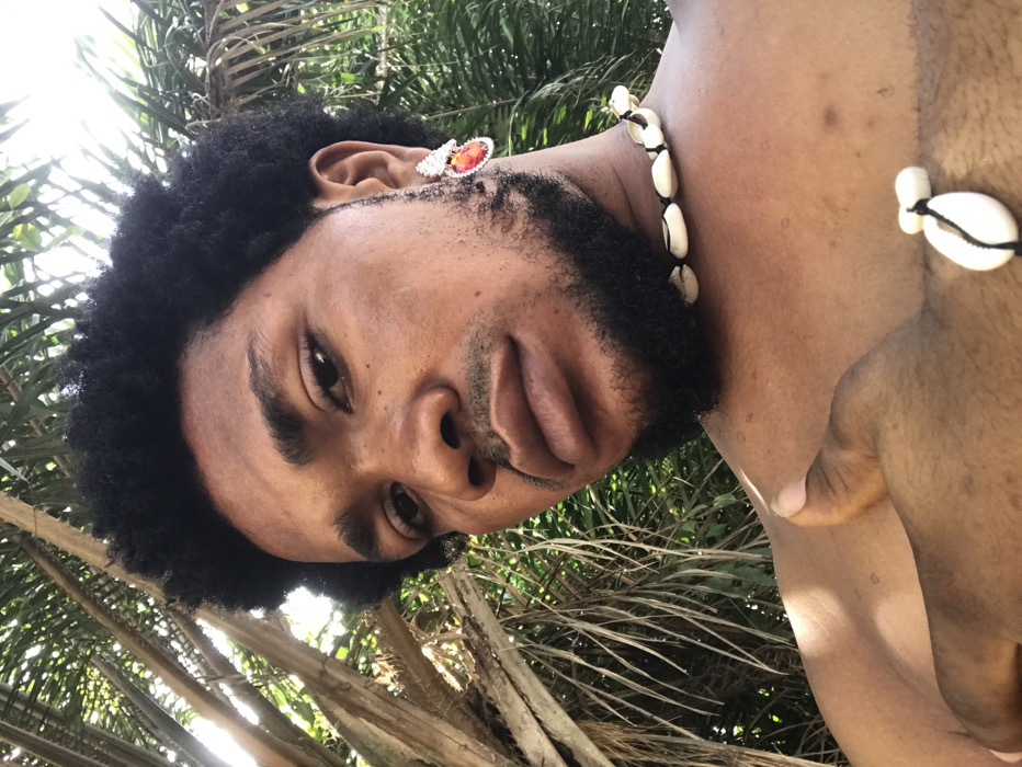 A close-up, chest-up portrait captures an adult male in an outdoor setting in Igbologun, Nigeria. The individual has dark skin, black curly hair, and a trimmed beard and mustache. He is shirtless, revealing his upper chest and right shoulder. In his right ear, he wears a large earring featuring white stones surrounding a prominent orange-red gem. A choker-style necklace made of white cowrie shells strung on a black cord adorns his neck, and a matching cowrie shell bracelet is visible on his left wrist. His right hand is raised, with the thumb visible pointing upwards. The man looks directly into the camera. The background consists of dense green foliage and brown fibrous tree trunks, indicative of palm trees or similar tropical vegetation, with natural sunlight filtering through the leaves.