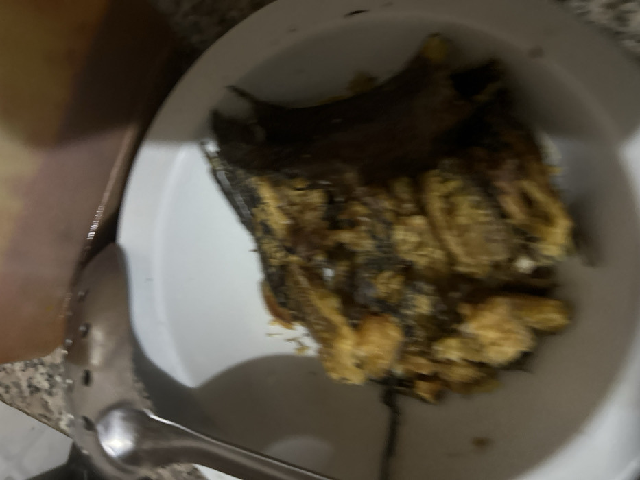 A slightly out-of-focus, overhead shot reveals a white plate filled with a dark, seemingly fried food item. Its surface is textured with patches of dark brown and lighter yellow. A portion of the food appears to be the skin or outer layer. A metal slotted spoon rests beside the plate. The plate is situated on a surface that appears to be a countertop, and part of a yellow container or object is visible in the upper left corner.