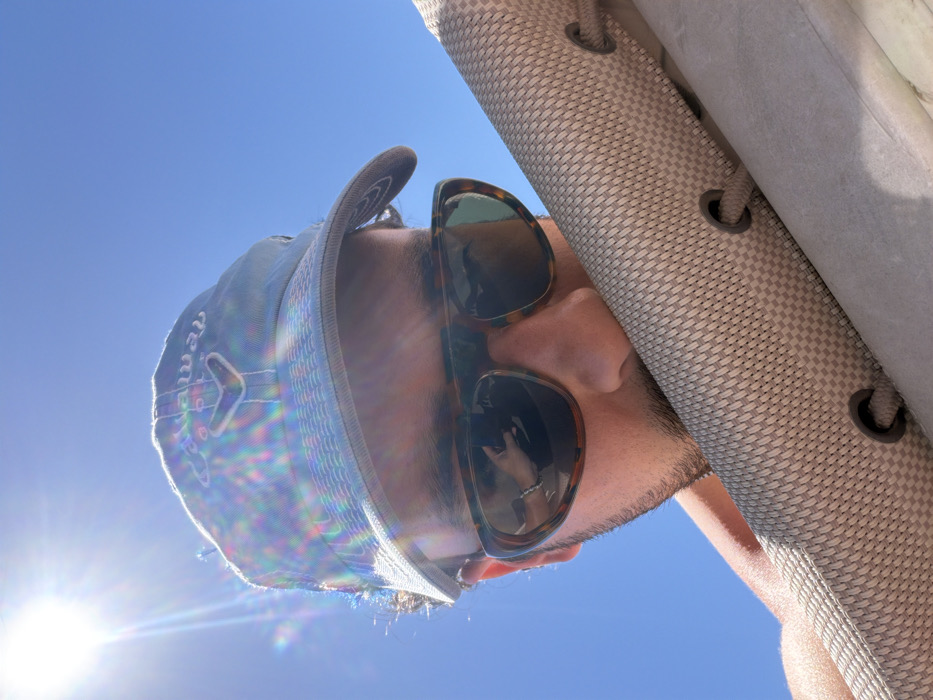 A low-angle perspective shows a person wearing a hat and sunglasses against a bright blue sky. The sun flares intensely to the lower left. Part of a light-colored, textured awning or cover is visible on the right, featuring grommets. The person's face is angled down, with facial hair evident. The hat is light blue with a darker brim, and the sunglasses have a tortoise-shell pattern. A reflection is visible in the sunglasses lenses.