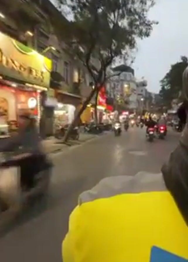 A person wearing a helmet and a yellow and gray jacket rides on a motorcycle on a street in Vietnam. Many other motorcycles are also on the road. The buildings on either side of the street have shops and restaurants. The Vietnamese flag is visible on one of the buildings.