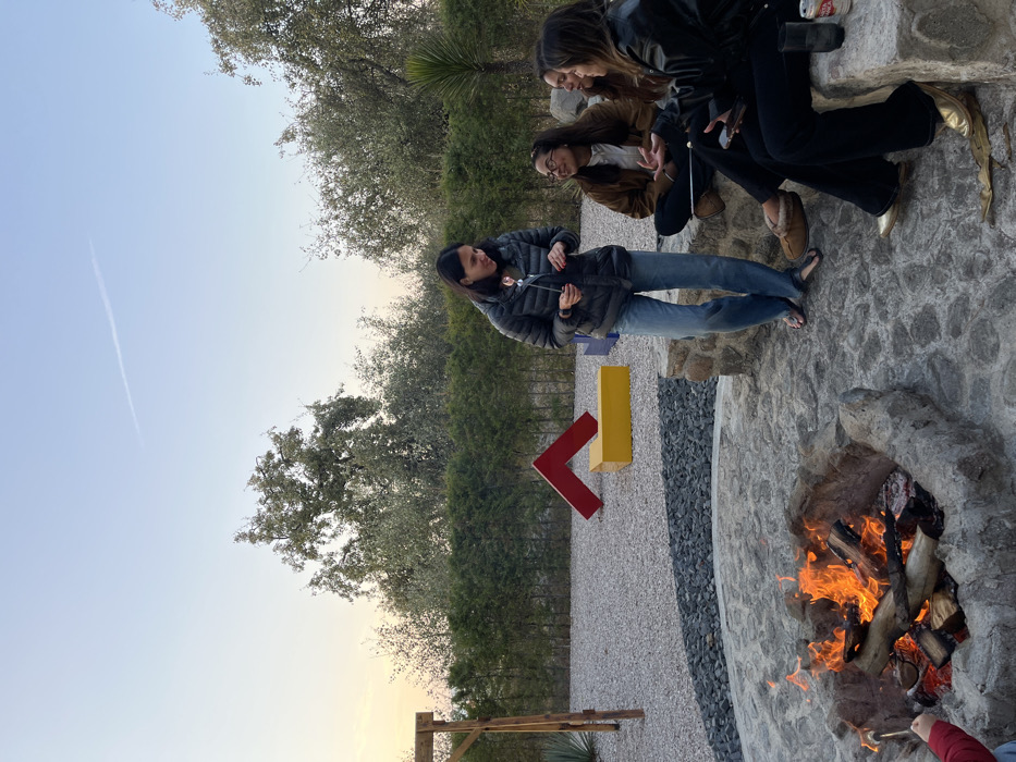 An outdoor gathering shows three women near a stone wall, and another woman standing with a skewer by a fire pit. Colorful, angular art installations are placed in the gravel area. Flames flicker within the pit. The sky is pale. Trees and greenery are visible in the background, creating a natural setting.